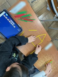 棒を使って、形を作っていました。「棒の先と先が離れないように、形も閉じるように」...