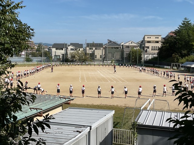 4年生は運動場で踊る場所を確認しながらエイサーの練習、