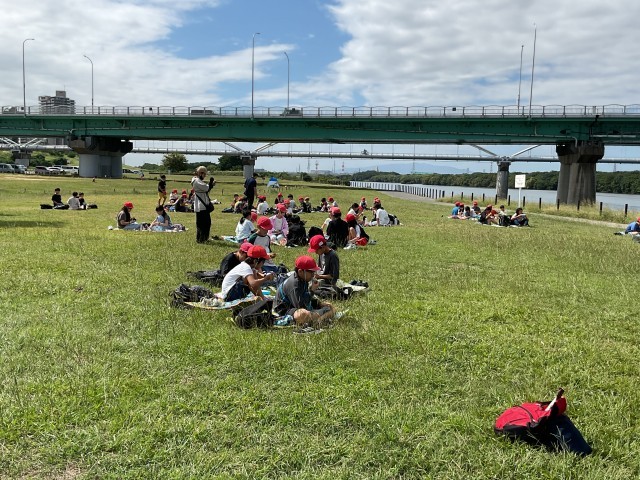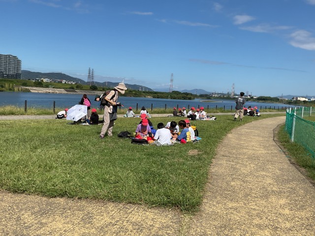 お昼は淀川の河川敷でお弁当タイム。日差しが強くて暑かったのですが、友だちと笑顔でお弁当を広げる姿が見られました。