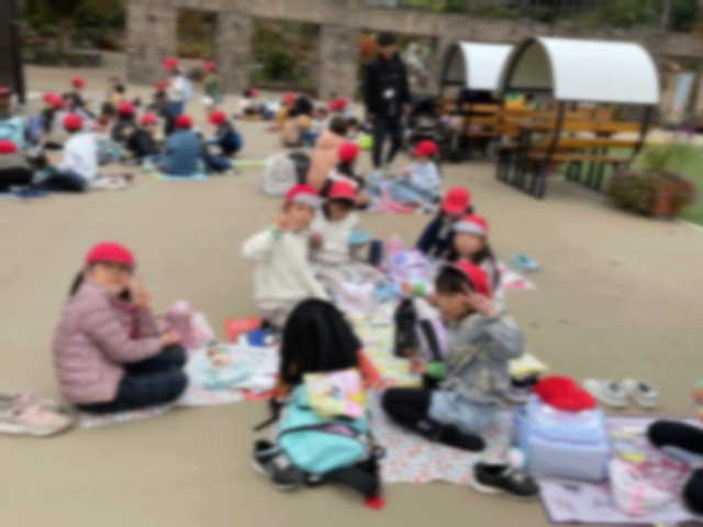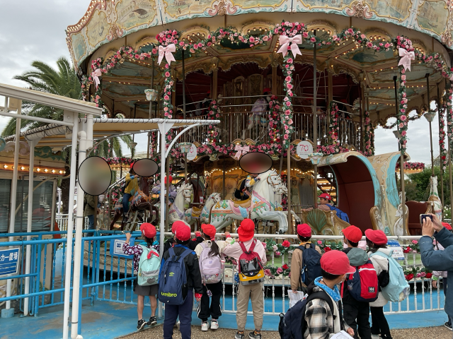 班ごとに相談して乗り物に乗りに行き、笑顔いっぱいの時間を過ごし、「お腹ペコペコ〜!」と集合場所のローズガーデンに戻ってきました。