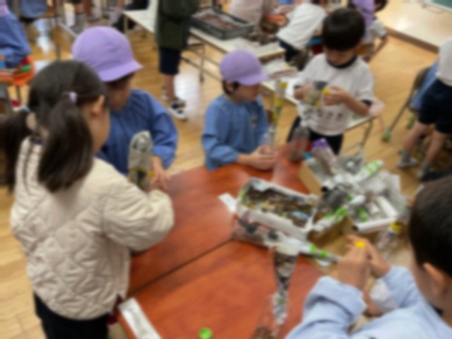 この日は、どんぐりや松ぼっくりなど秋の自然に触れながら、こまや楽器づくりなどを一緒に楽しみました。小さな手で工夫しながら作る姿や、笑顔で会話を交わす様子が見られ、温かい時間となりました。