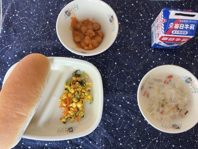 今日のメニューは、コッペパン、冬野菜の米粉クリームスープ、コーンソテー、カスレ、牛乳でした。