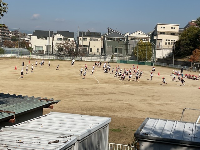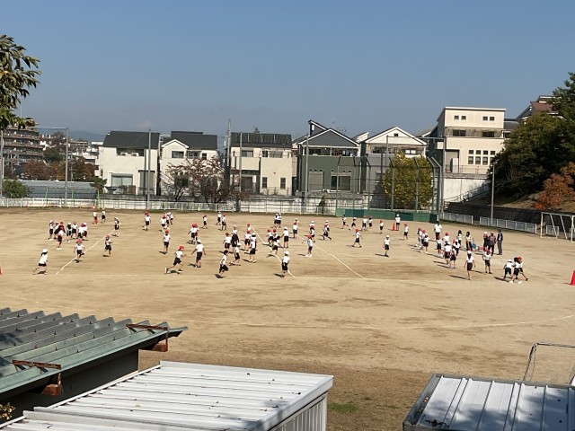2年生は運動場で鬼ごっこをして、思いきり走り回っていました。全力で走る姿がとても印象的でした。また、赤玉を相手のラインを抜けてゴールまで運ぶゲームにも挑戦し、チームで協力しながら楽しんでいました。