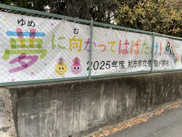 記念の横断幕は、児童のアンケートでデザインを選びました。子どもたちの思いが込められた横断幕は、「香里小学校前」のバス停前に掲げています。お近くにお越しの際は、ぜひご覧ください。