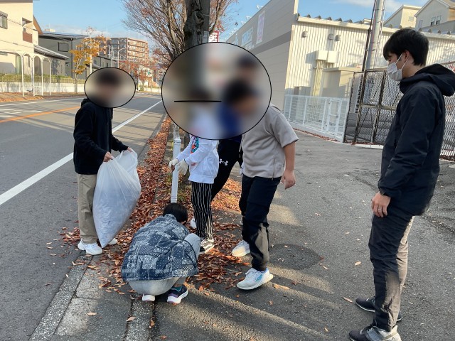 みんなで落ち葉を集めながら、学校をきれいにする取り組みです。45Lのビニール袋が落ち葉でパンパンになっていました。