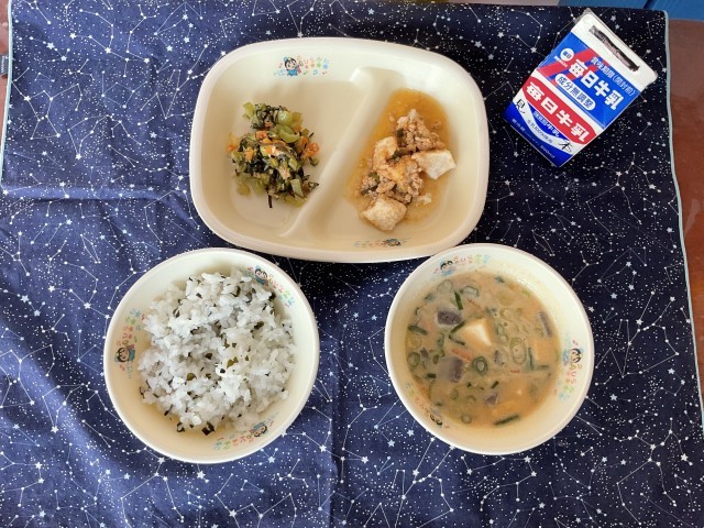 今日のメニューは、わかめごはん、ごじる、あげ里芋のそぼろあんかけ、小松菜とツナのゆずあえ、牛乳でした。