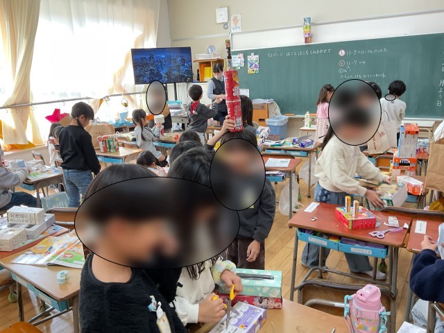 図工では「はことはこをくみあわせて」の学習をしました。たくさん集めた箱の中から使いたいものを選んで、重ねたり、ひっつけたり、穴をあけたり…いろいろな工夫をしながら形を作っていました。箱を組み合わせると、いろんなものに変身するのがおもしろいですね。どんな作品になるのか、とても楽しみです!
