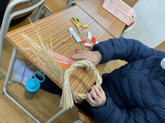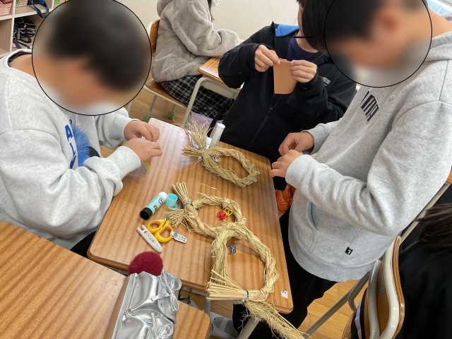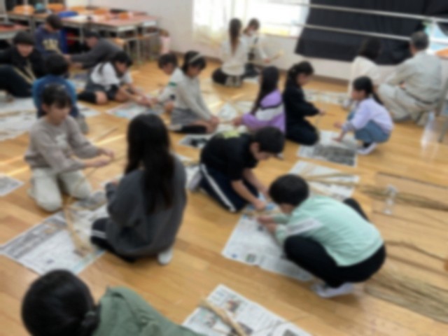 しめ縄づくりに挑戦しました!先生は、なんと校務員さん。コツを教えてもらいながら、友達と一緒に縄をなっていました。みんな真剣な顔で作業していました🎵