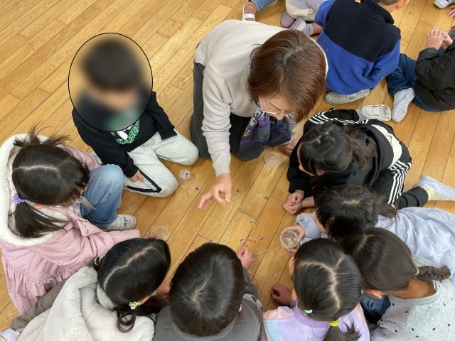 ひもごまやおはじき、けん玉、お手玉に挑戦し、「初めてできた!」とたくさんの笑顔が見られました。あたたかく見守り、丁寧に教えてくださった皆様に、心より感謝いたします。