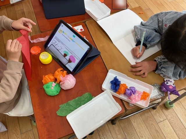 図工では、お花紙を小さく丸めて形をつくり、思い思いの作品づくりを楽しんでいました。色とりどりのお花紙が、子どもたちの手の中で素敵な作品に変わっていく様子がとても微笑ましかったです。
