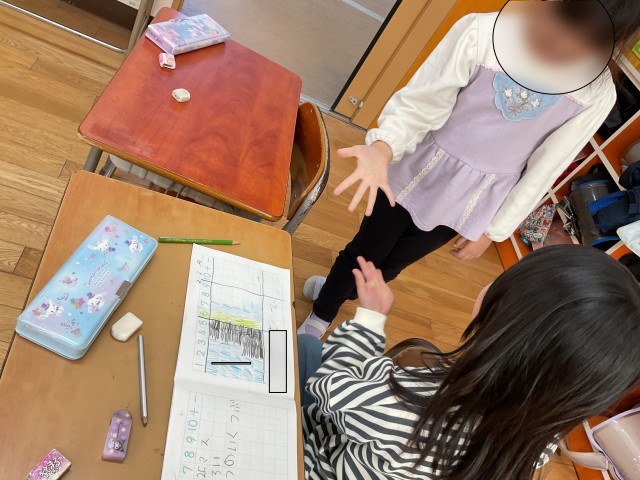 算数では、お友達と一緒に“陣取りゲーム”をしながら、広さくらべの学習をしていました。楽しみながら学んでいる姿が印象的でした。