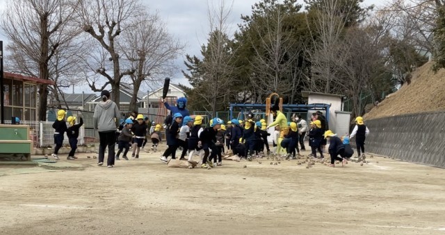 子どもたちは、まめに見立てた紙のボールを握りしめ、「おにはそとー!」と勇気いっぱいに鬼退治。