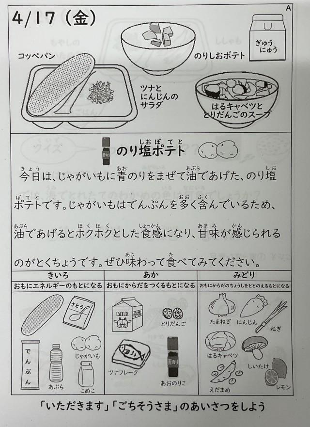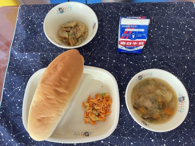 今日の献立は、コッペパン、牛乳、春キャベツと鶏団子のスープ、ツナと人参のサラダ、のり塩ポテトです。