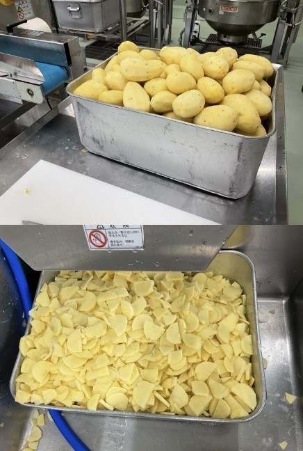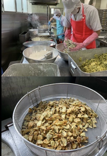 のり塩ポテトは、ジャガイモをスライサーという一度にたくさんの野菜を切ることができる機械で薄く切って青のりと塩をまぶして米粉と片栗粉をつけて油で揚げました。子供達は笑顔でたくさん食べてくれました。