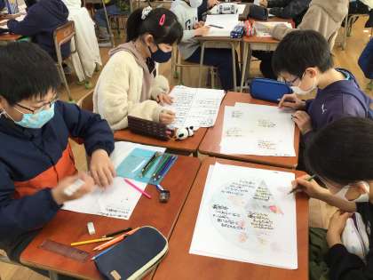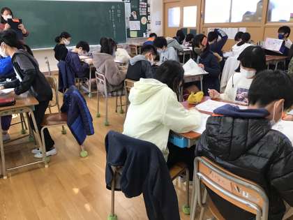 先ほどとは別のクラスです。それぞれの作品を互いに読み合いながら、良かった点などをコメントしています。友達にどのように評価されるかワクワクしながら、読み合っていました。