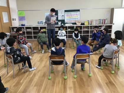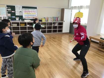時間割の関係で、節分の日には設定できなかった低学年グループの豆まきが行われました。赤鬼さんを退治したと思ったら登場した黒鬼さん。子ども達は歓声を上げながら、豆まきを楽しみました。その後は輪になって皆でルールを守ってゲームをしました。