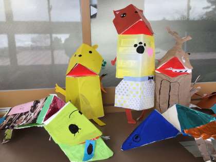 集合形式の6年生とのお別れ会はできないけれど、今、全学年で密かに・・・。これは2年生のあるクラスの様子です。別のクラスの廊下には、図工で作った可愛い作品が並んでいましたので写真に撮りました。