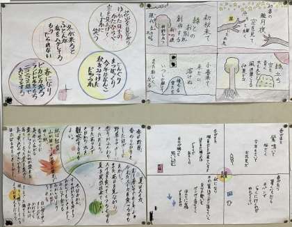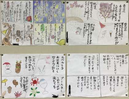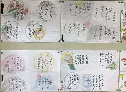国語の教科書に「春はあけぼの」で始まる枕草子が載っています。四季それぞれについて、清少納言が心ひかれるものを綴っているのですが、子ども達も「今風」にアレンジしました。本当に素敵で全員分を載せられないのが残念!