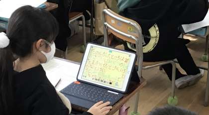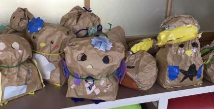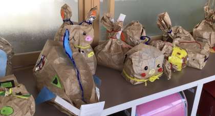 紙袋で作った図工の作品。今日は鑑賞会のようです。互いの作品の良いところを見つけ合っています。実は、この学習はとても大切だと思っています。正解はありませんから、工夫したところや素敵だなと思ったところを互いに見つけ、今後の自分の作品に活かしたり、友達を尊重する姿勢につなげられるからです。