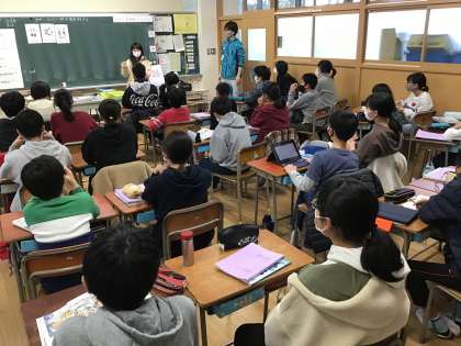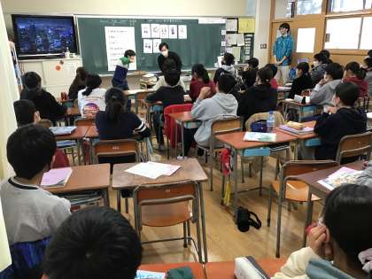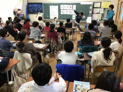 廊下を通ると何やら楽しい笑い声が聞こえてきました。外国語活動の授業で、部活をジェスチャーで表現していたのです。出席番号で当てられた人が前に出てきて、示された部活の様子をジェスチャーで伝えていました。