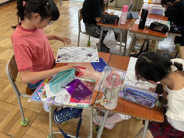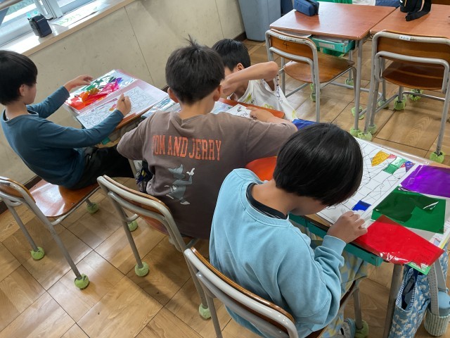 4年生の図工では「タックステンド」と言って、銀紙と色セロハンを使ったステンドグラス調の作品を制作しています。