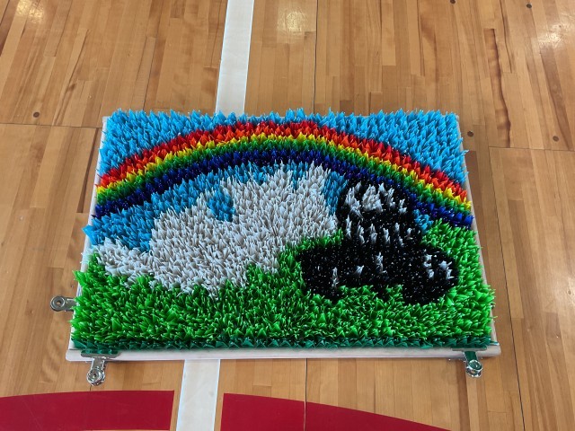 6年生がもうすぐ修学旅行へ行くので、千羽鶴の完成披露と平和セレモニーの発表がありました。