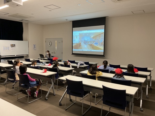 今図書館は改装中で、中は見ることができませんでしたがスクリーンに館内を映し、バーチャル体験をしました。