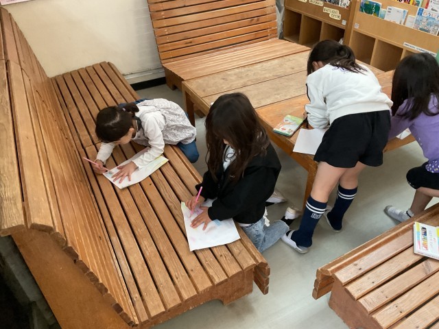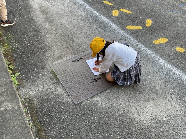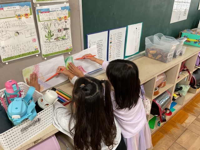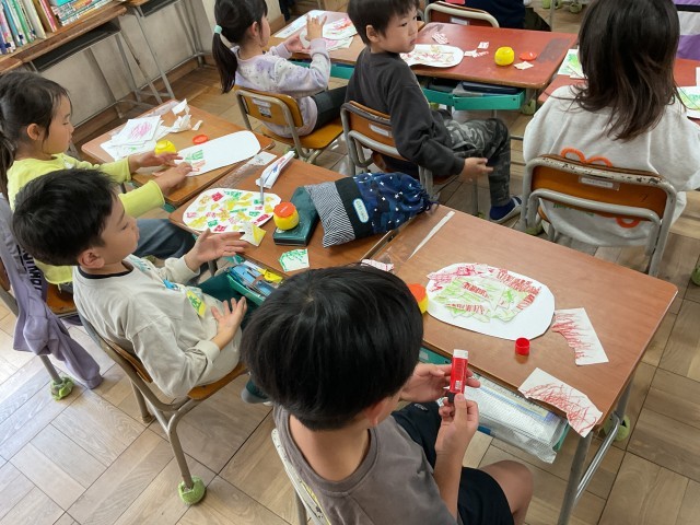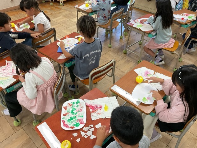 1年生では、紙をでこぼこしたいろんな場所に置いて、それを色鉛筆やクレパスでうつし取っています。地面の形がうつって面白いですね!