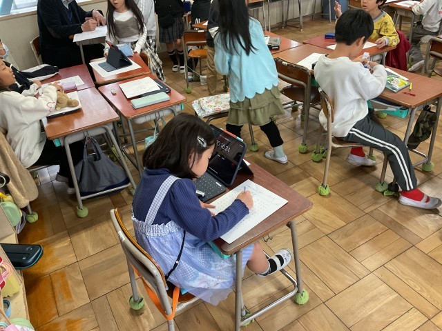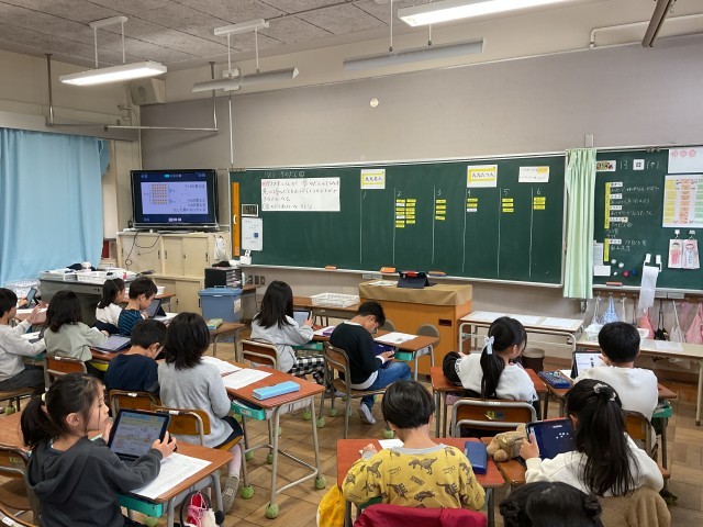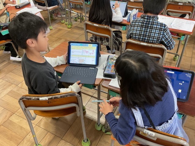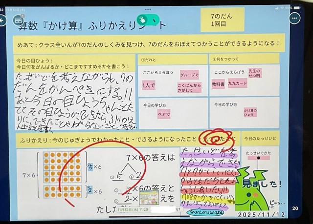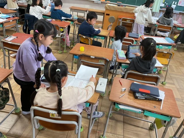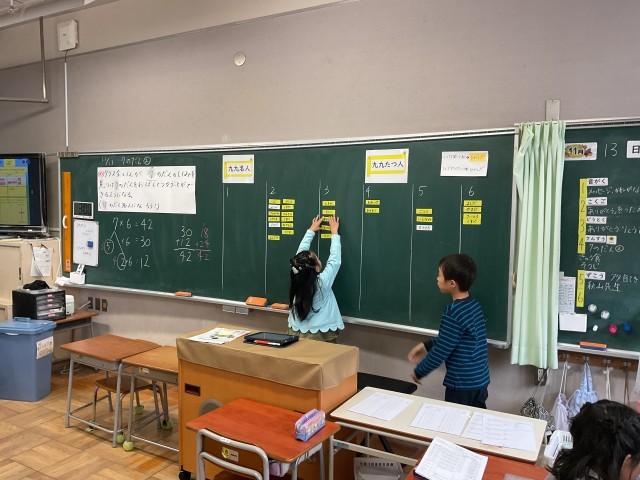 2年生は友達と協働しながら、時には一人で黙々と、そしてタブレットや九九カード、ノートやプリントを使って練習します。