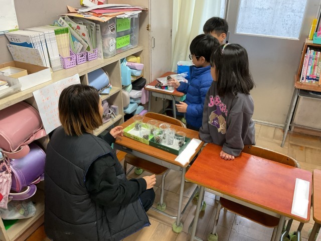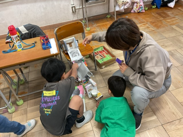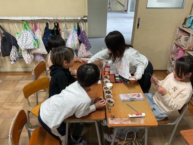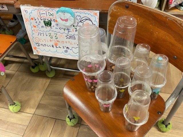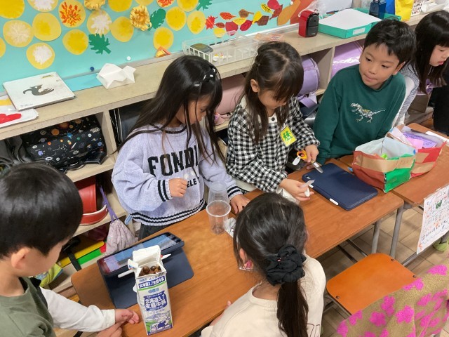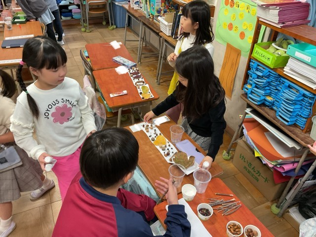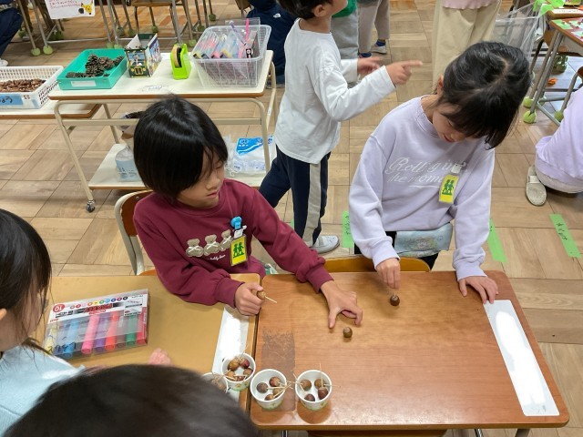 1年生の生活科では今秋の自然(どんぐりや松ぼっくり、葉っぱなど)を活用したおもちゃづくりをしています。来週に幼稚園や保育所の人たちが来て、つくったおもちゃでお店屋さんのように遊んでもらう予定です。