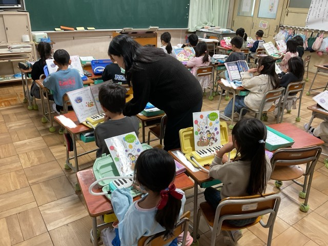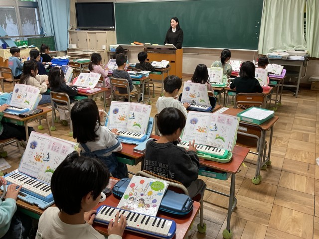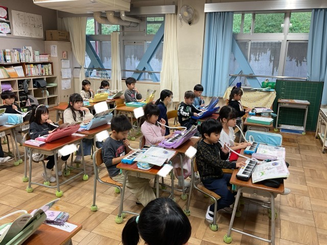1年生の音楽では鍵盤ハーモニカの練習をしています。