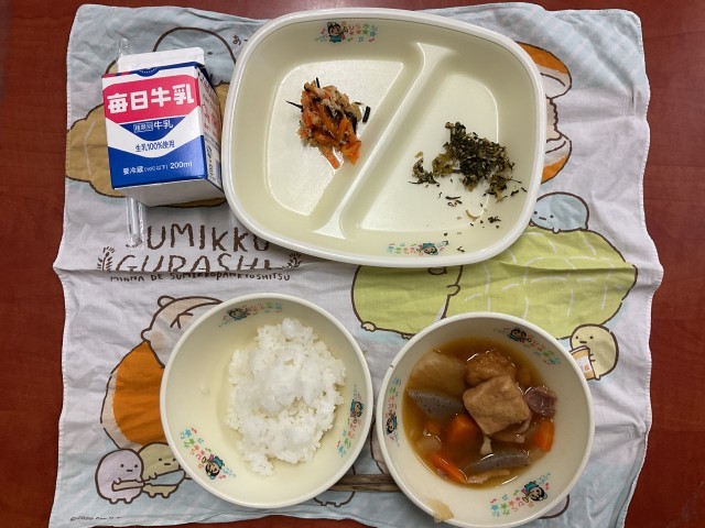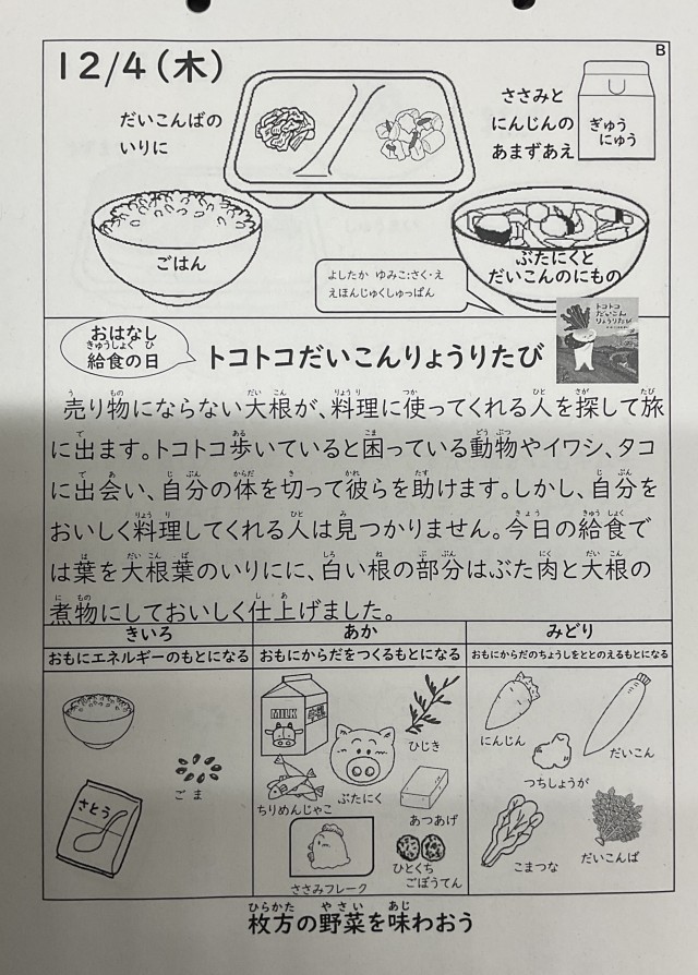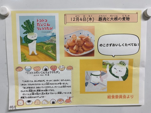 せっかく大きく育ったのに、売り物にならない大根が自分を料理に使ってくれる人がいないか旅に出るお話です。ちょうど枚方市の給食センターにやってきたのかな?今日の給食は大根の葉や豚肉と大根の煮物が出ましたね。