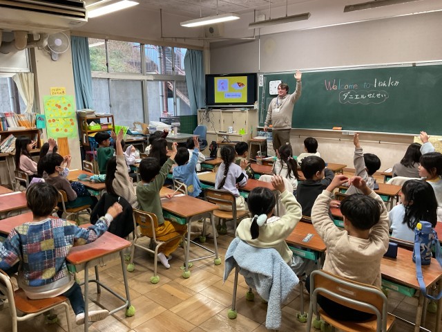 最初は「何言っているのかわからない〜」と言っていた1年生も、絵や身振り手振りなどを通して理解していき、最後には楽しそうに英語に触れていました。