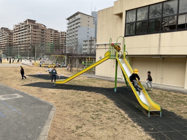 1年生は中庭で鬼ごっこや滑り台、ブランコ。