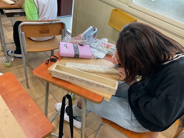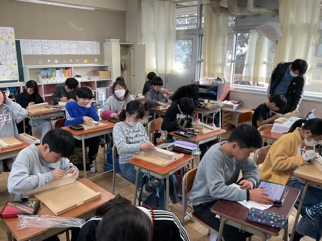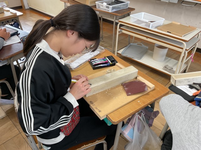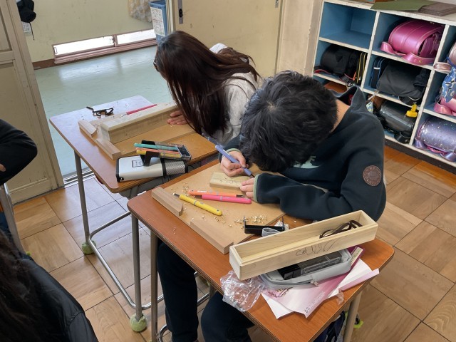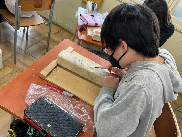 6年生では、卒業に向けて卒業証書ホルダーを彫刻刀で掘ってデザインしています。