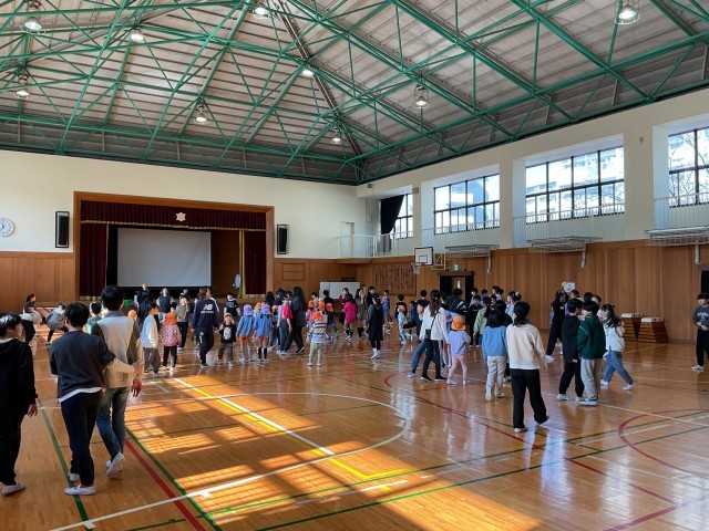 まずは体育館で一緒い遊んだ後、給食を食べました。