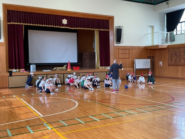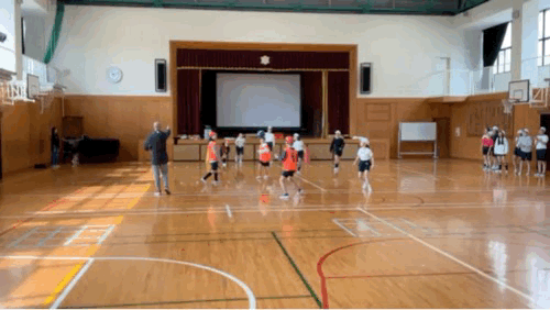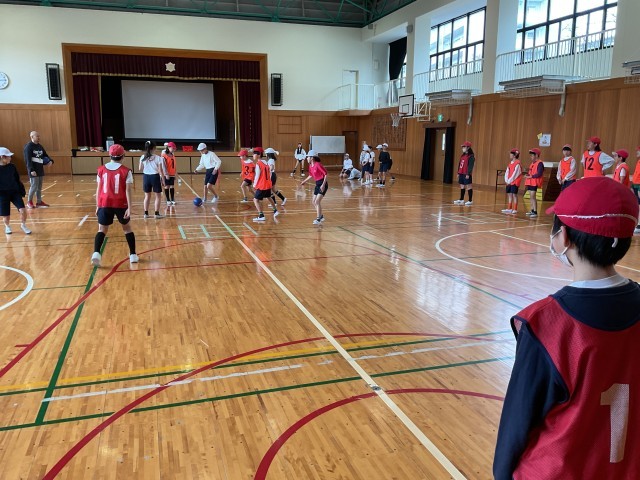 今日は試合に近い方法でゲームをしています。順番に並んで、先生が言った人数がコート内に入ってゲームをします。