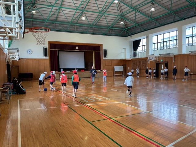 5年生の体育では、ゴール型ゲームの一環でサッカーをしています。
