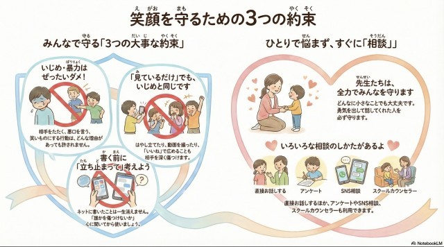もし、自分が苦しい時や、困っている友達を見つけた時は、すぐに先生たちに教えてください。直接言うのが恥ずかしければ、アンケートや相談シートを使っても大丈夫です。先生たちは、勇気を出して話してくれた人を、全力で守ります。