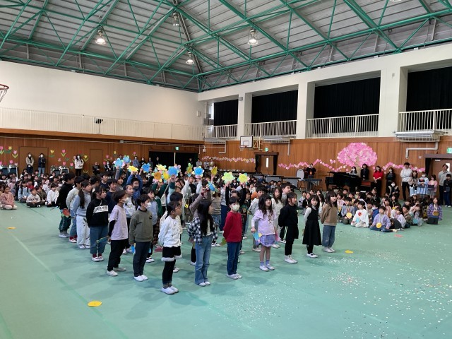 最後は「スマイル」の歌のプレゼントと、6年生一人一人の名前を書いた手作りの花を振りながらお別れをします。