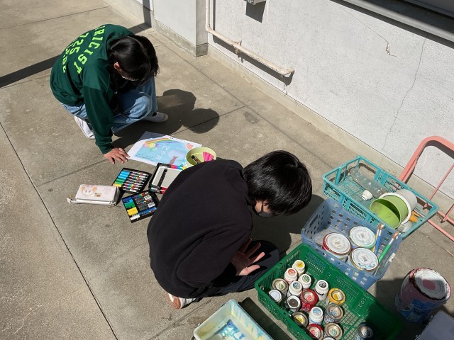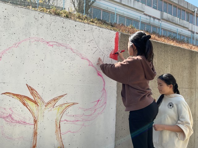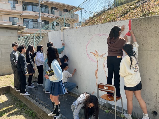 校務員さんが壁をきれいにしてくれて、そこへ6年生がデザインした絵を描いていきます。
