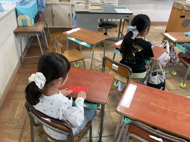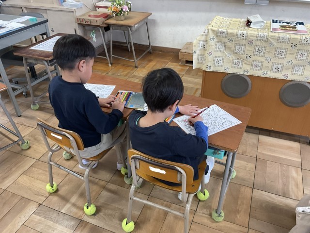 縄跳びをする子、フラフープをする子、お絵描きや色塗りをする子、折り紙をする子、絵本を読む子・・