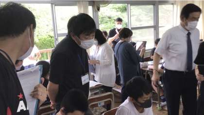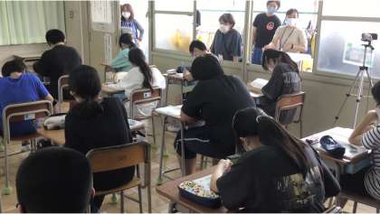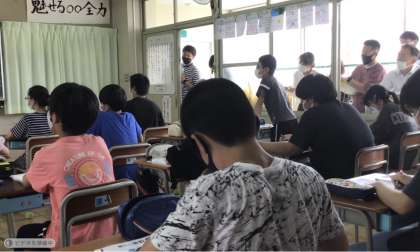まず5時間めは先生方全員が研究授業を参観。緊急事態宣言は解除されたものの、先生方は全員教室に入らずに廊下とベランダに分散して参観しました。