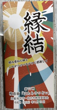 1月12日は成人の日でした。枚方第四中学校にて、はたちのつどいがあり来賓として参列してきました。成人年齢が18歳となったため、成人式ではなく「はたちのつどい」となりました。枚方市で20歳を迎える成人は...