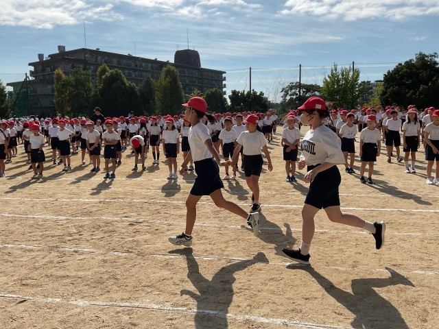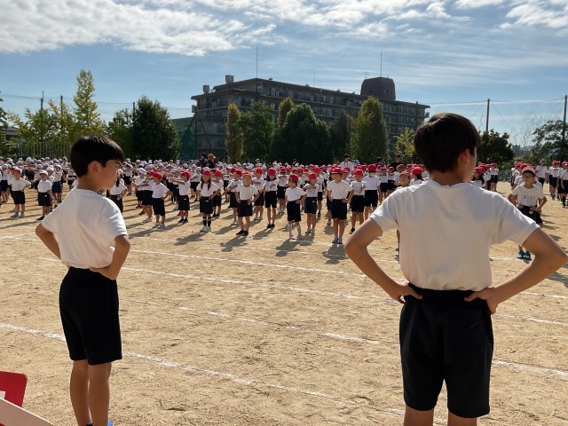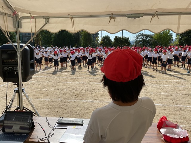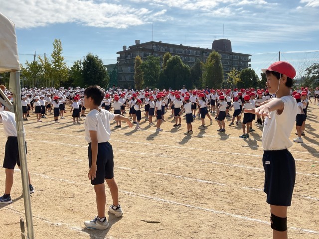 児童会三役が、体操隊形1、2、3のお手本を見せています。