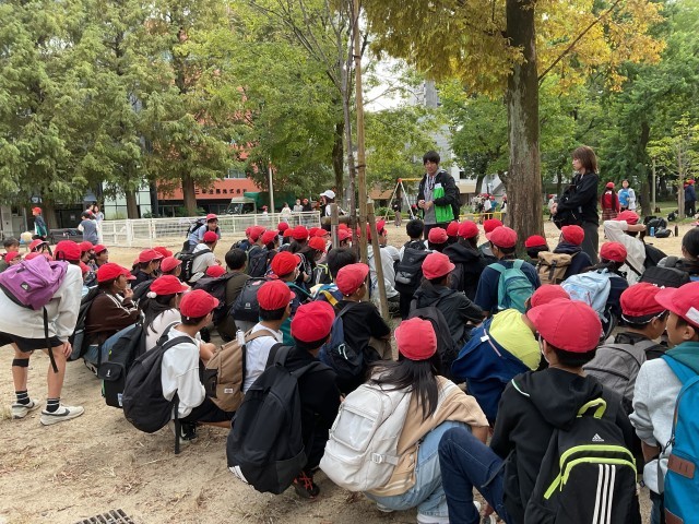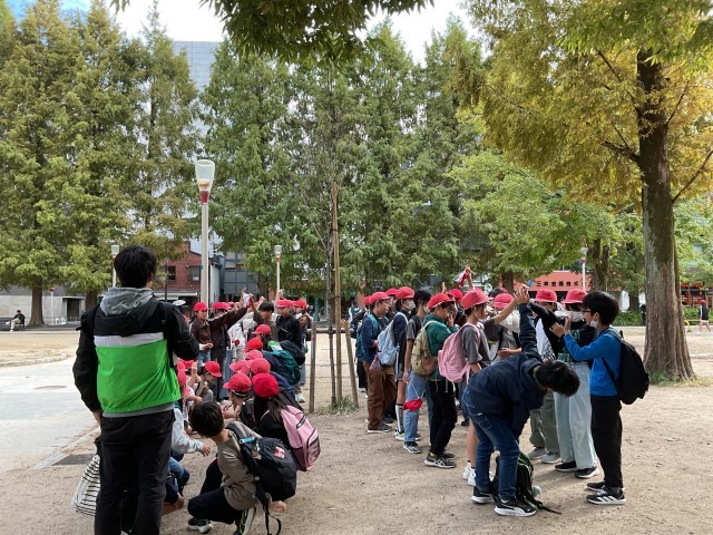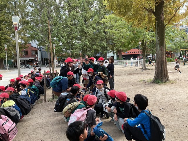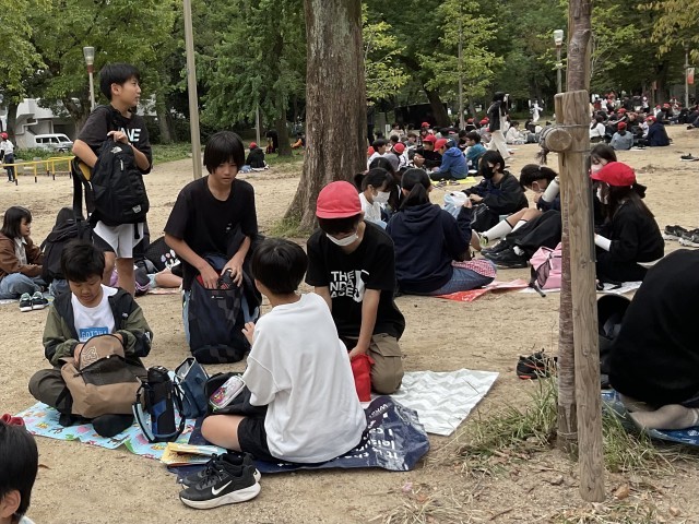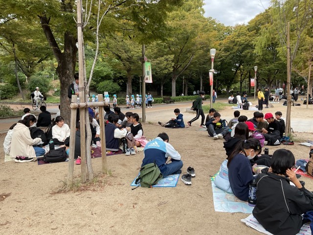 靭公園では、観劇を終えたたくさんの学校が昼食をとっていました。