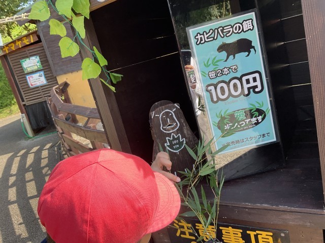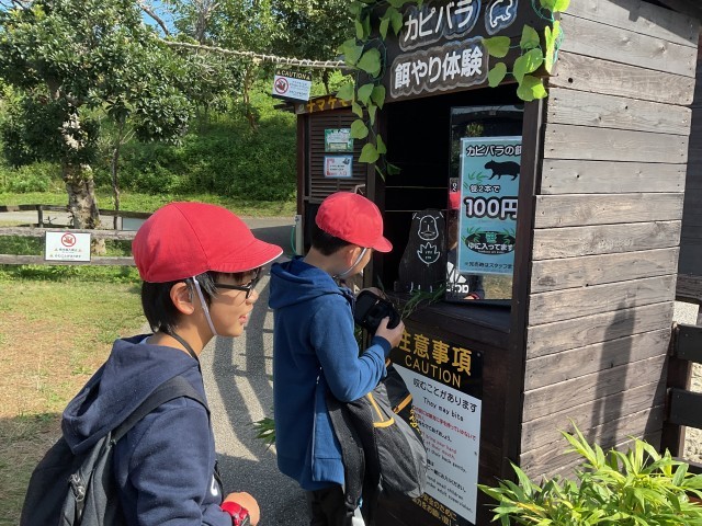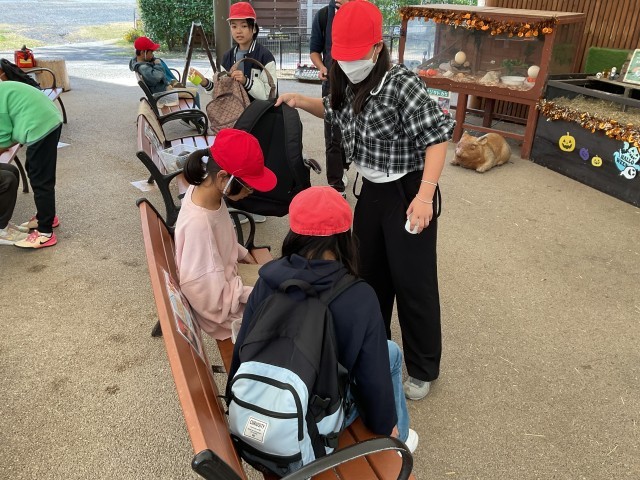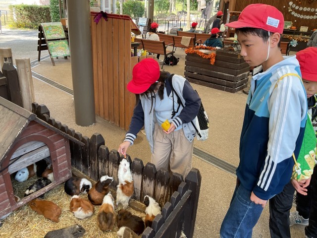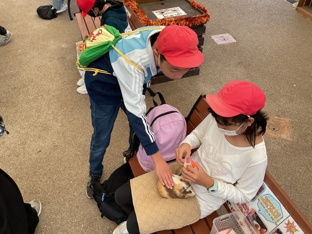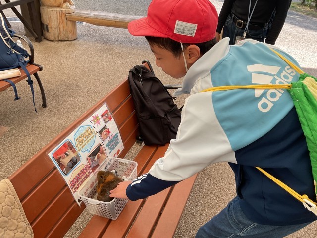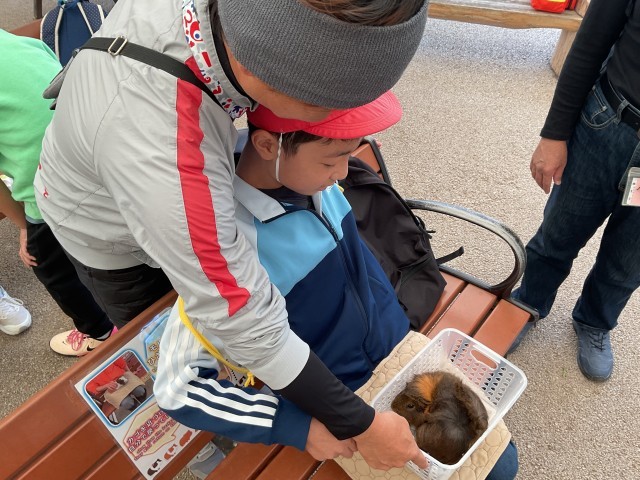 モルモット体験をしてみましょう。まずはかごごとひざの上において。。。