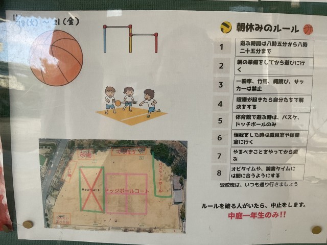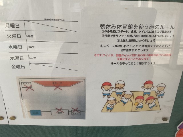 ②始業前の朝休みに運動場と体育館で遊べる案です。