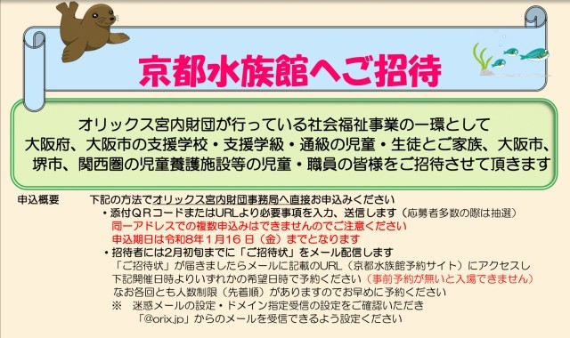 【宮内財団より京都水族館にご招待企画】 公開日 2025/12/09 更新日 2025/12/09 お知らせ・緊急連絡 公益財団法人オリックス宮内財団よりお知らせがありましたので、情報提供いたします。なお、問い合わせ等につきましては、直接「公益財団法人 オリックス宮内財団」にお願いいたします。応募資格をよくご覧の上ご応募ください。↓↓↓【オリックス宮内財団 京都水族館ご招待】 いいね(0)