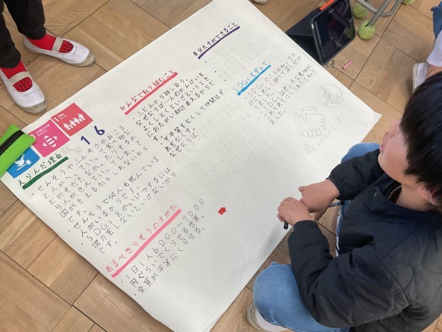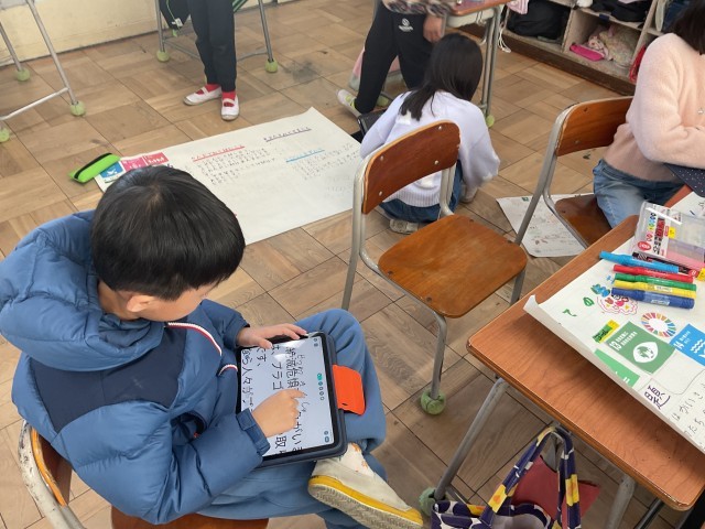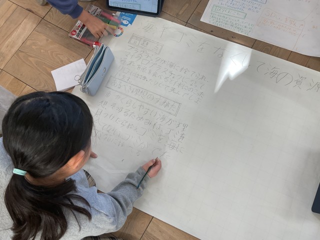 大きな模造紙を広げ、ペンを持ってウンウン悩んでいる児童。